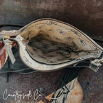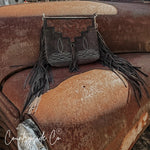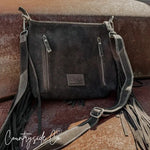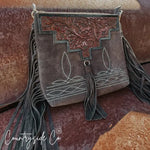 Saddle up with this stylish leather purse! This bag features a boot stitch design and is made with luxurious suede.  Adorned with fringes and tooled leather, you will make a statement with this bag!
