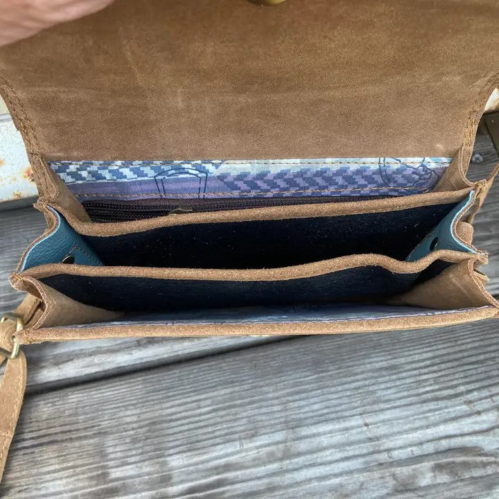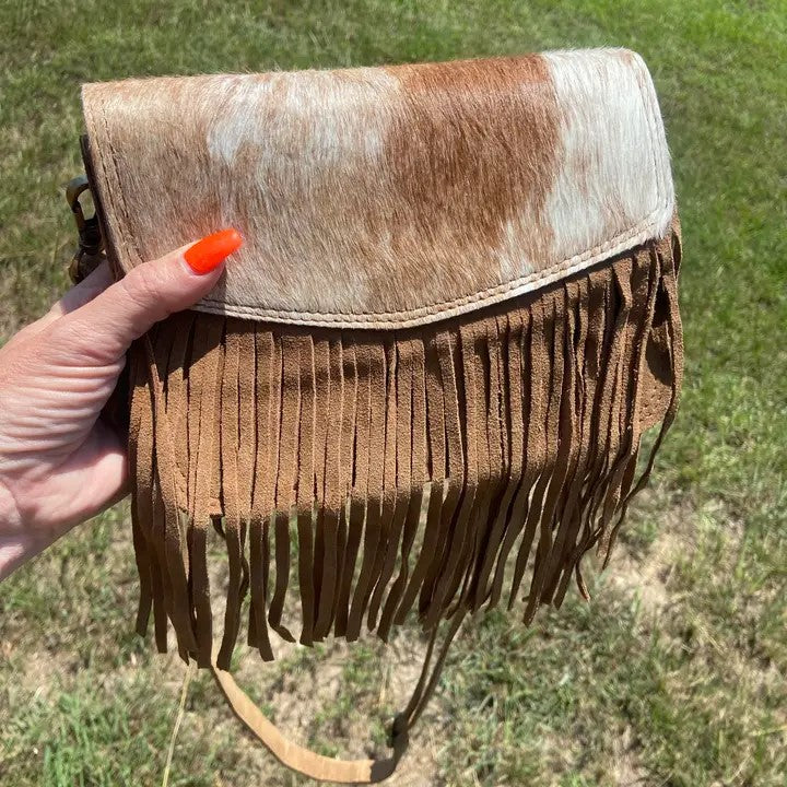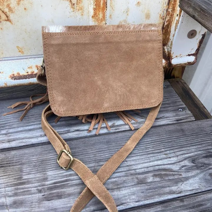 Cowhide and Tan Suede Fringe Crossbody Purse