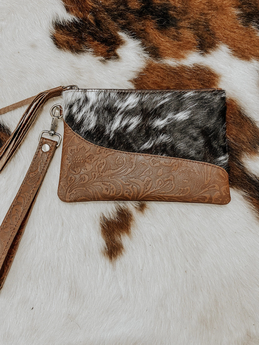 This wristlet brings a touch of countryside charm to your next outfit!  Crafted with genuine cowhide and embossed leather, it features a convenient side zipper pocket, while the detachable wristlet adds versatility.