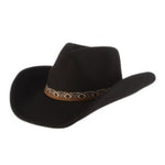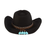 Looking for a stylish accessory that can elevate your cowgirl look to new heights of elegance? Look no further than Motya, a women's wool felt western hat, featuring an exquisite Aztec band and stunning turquoise attached to the tails. Crafted with the utmost care and attention to detail, this hat is the perfect choice for any fashion-conscious cowgirl looking to make a bold statement with her wardrobe. Available in black, chocolate, and pecan.