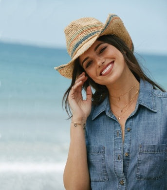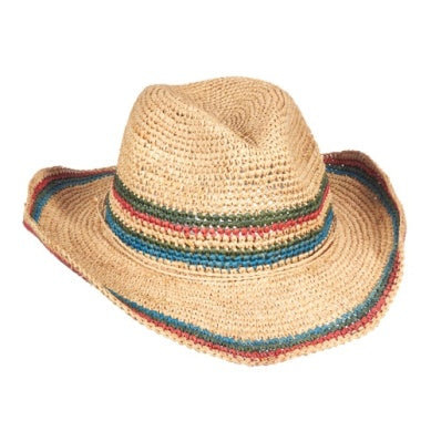 The Trezza is a great hat for the beach or any time you want to keep the sun off your face. This hand crocheted raffia straw western hat is shapeable so great for travel, too!